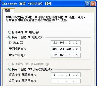 3.單擊彈出框中的自動獲取IP自動獲取地址DNS服務(wù)器地址分別修改為使用以下服務(wù)器地址IP使用以下地址和使用以下地址DNS服務(wù)器地址,并在IP輸入地址欄1922.168.0.在子網(wǎng)掩碼欄中輸入255.255.255.在默認(rèn)網(wǎng)關(guān)中加入192.168.0.1”,在首選DNS服務(wù)器地址欄輸入1.1.1.1”,最后點擊確定保存設(shè)置;