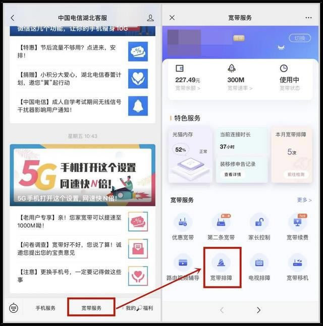 如果以上三種方法都做不到,可以去各省區中國電信客服官方微信官方賬號,選擇微信官方賬號菜單欄。【 寬帶服務