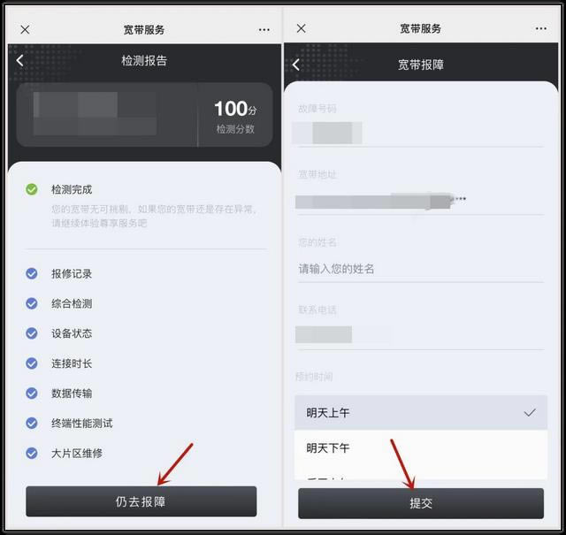 幫助您實時在線檢測網絡狀態,并根據您的檢測報告修復故障。 如仍不能恢復,可選擇報障預約師傅上門處理,一鍵報障快速完成!