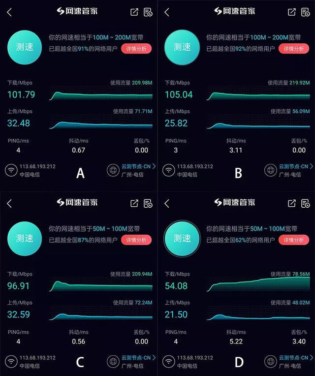 不過(guò)在 D 點(diǎn)的下載速率只有 50Mbps 上下,網(wǎng)絡(luò)抖動(dòng)和丟包也大幅增加。