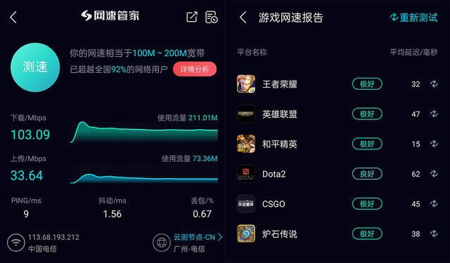 這次網(wǎng)速直接達(dá)到了接近 B 點(diǎn)狀態(tài),網(wǎng)絡(luò)抖動(dòng)和丟包也大幅下降。對(duì)于游戲愛(ài)好者來(lái)說(shuō),延遲也降低到了相對(duì)合理的范圍。