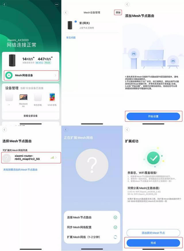 組成 Mesh 操作非常簡(jiǎn)單,只需要在米家或小米 Wi-Fi 打開(kāi)路由器相關(guān)頁(yè)面進(jìn)入手機(jī)應(yīng)用 Mesh 網(wǎng)絡(luò)設(shè)備,選擇設(shè)備,等待。