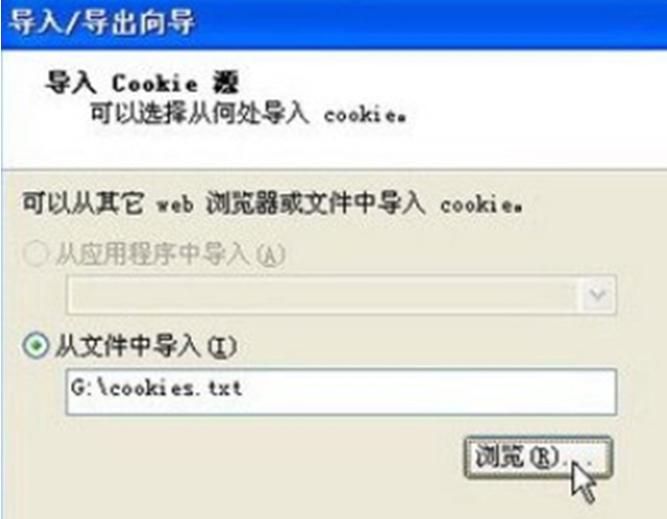 2、點(diǎn)擊“瀏覽”按鈕找到并選中事先導(dǎo)出的Cookie文件,并點(diǎn)擊“下一步”按鈕,選擇導(dǎo)入來(lái)源;