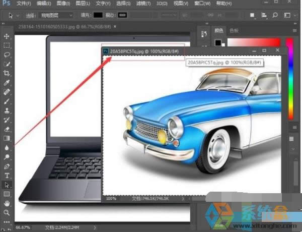 3、圖片在PS中打開后,我們點擊汽車圖片的標題處將該圖片窗口下拖,如圖所示。