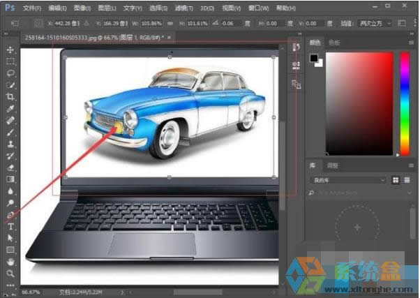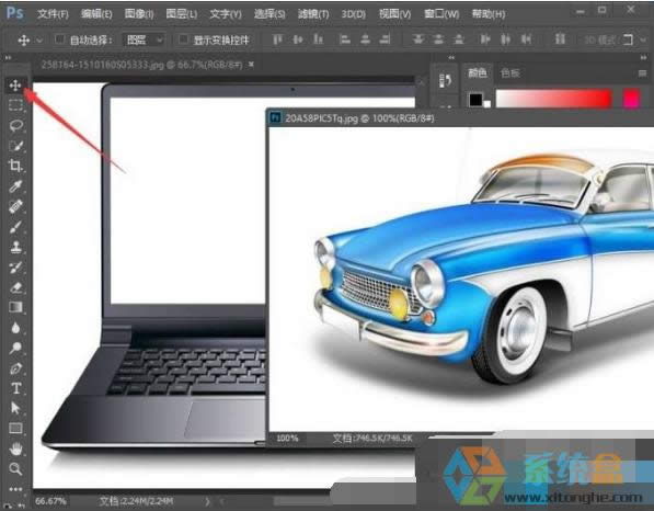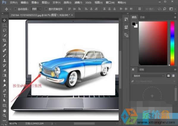 5、然后按住shift鍵拖動汽車圖片,使得兩張圖片在一個文件中顯示。